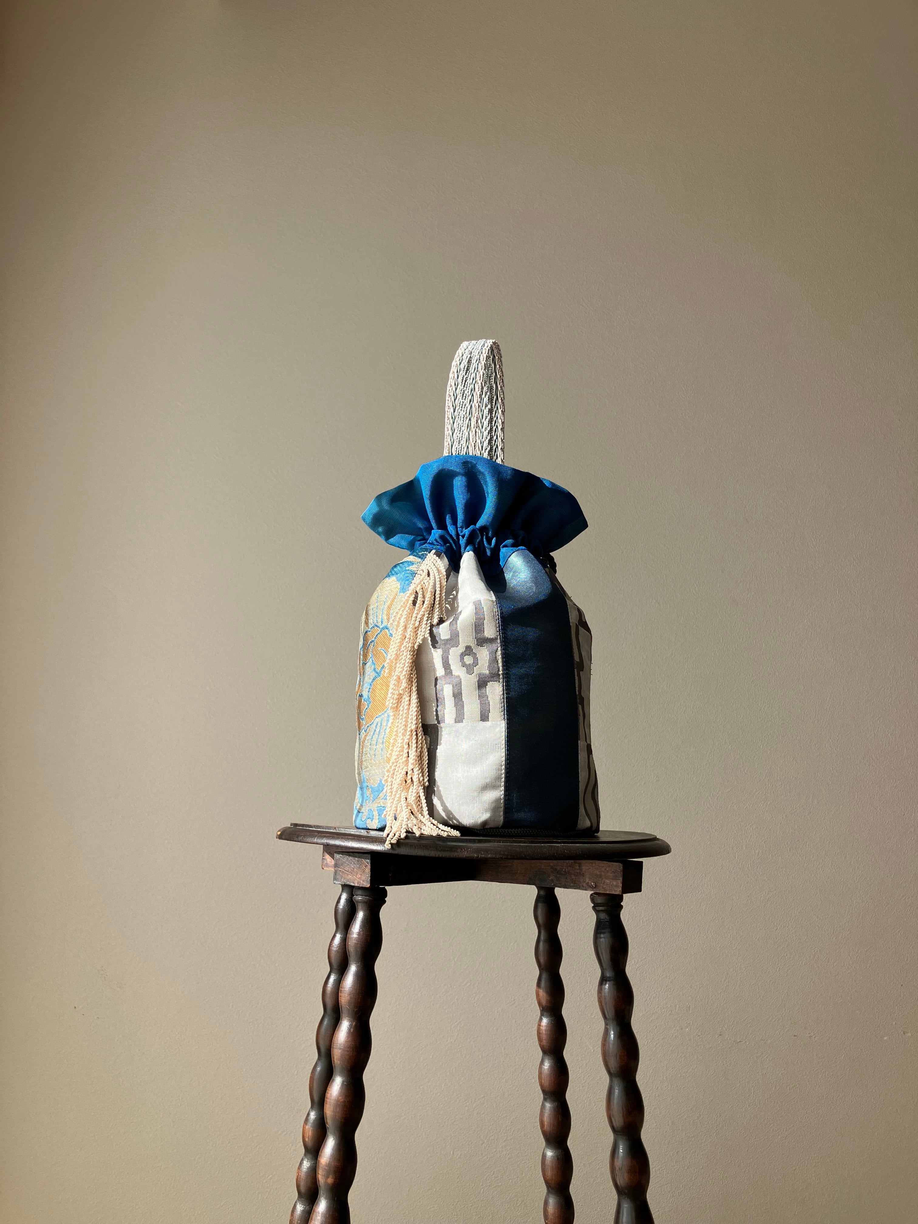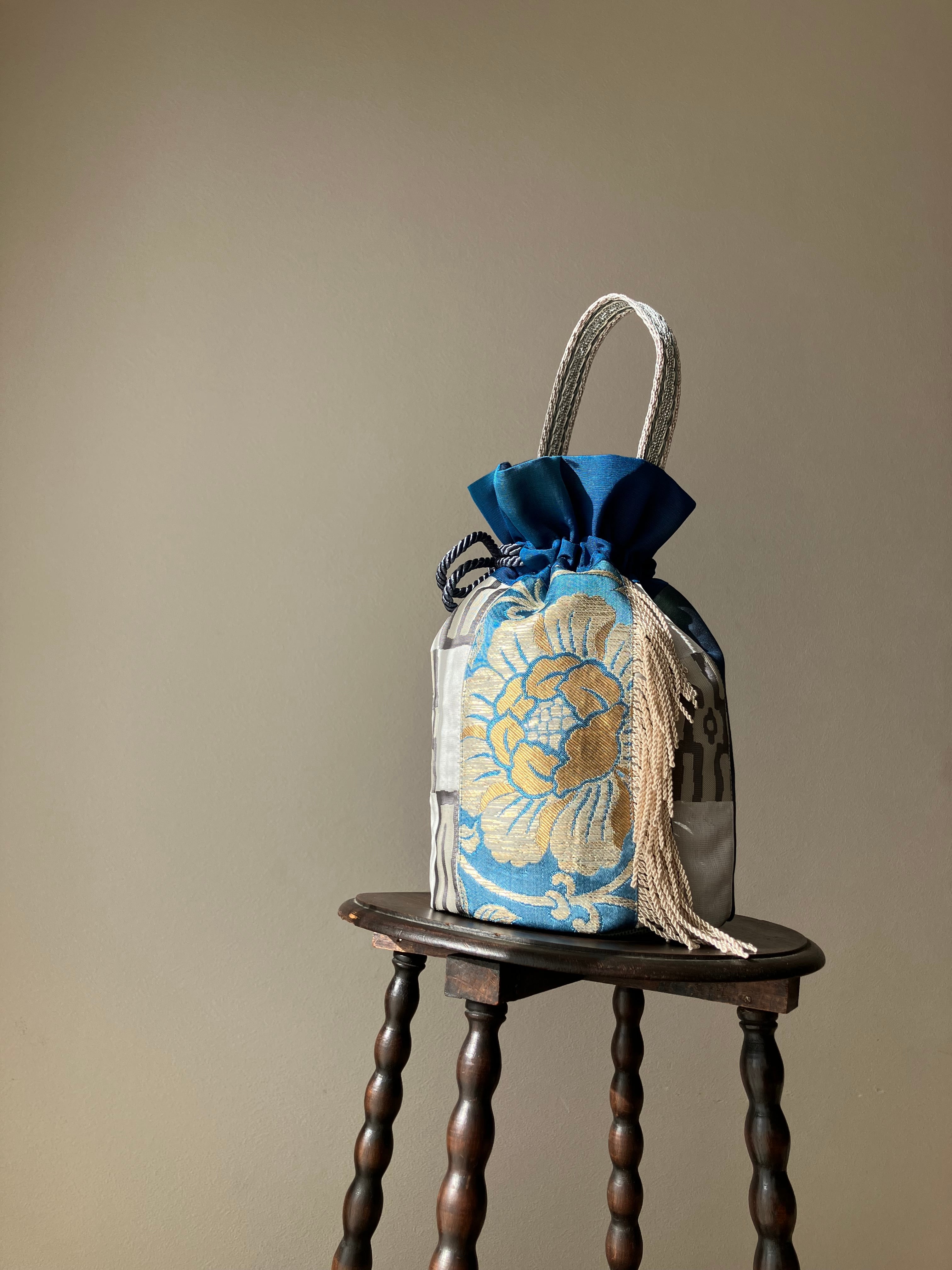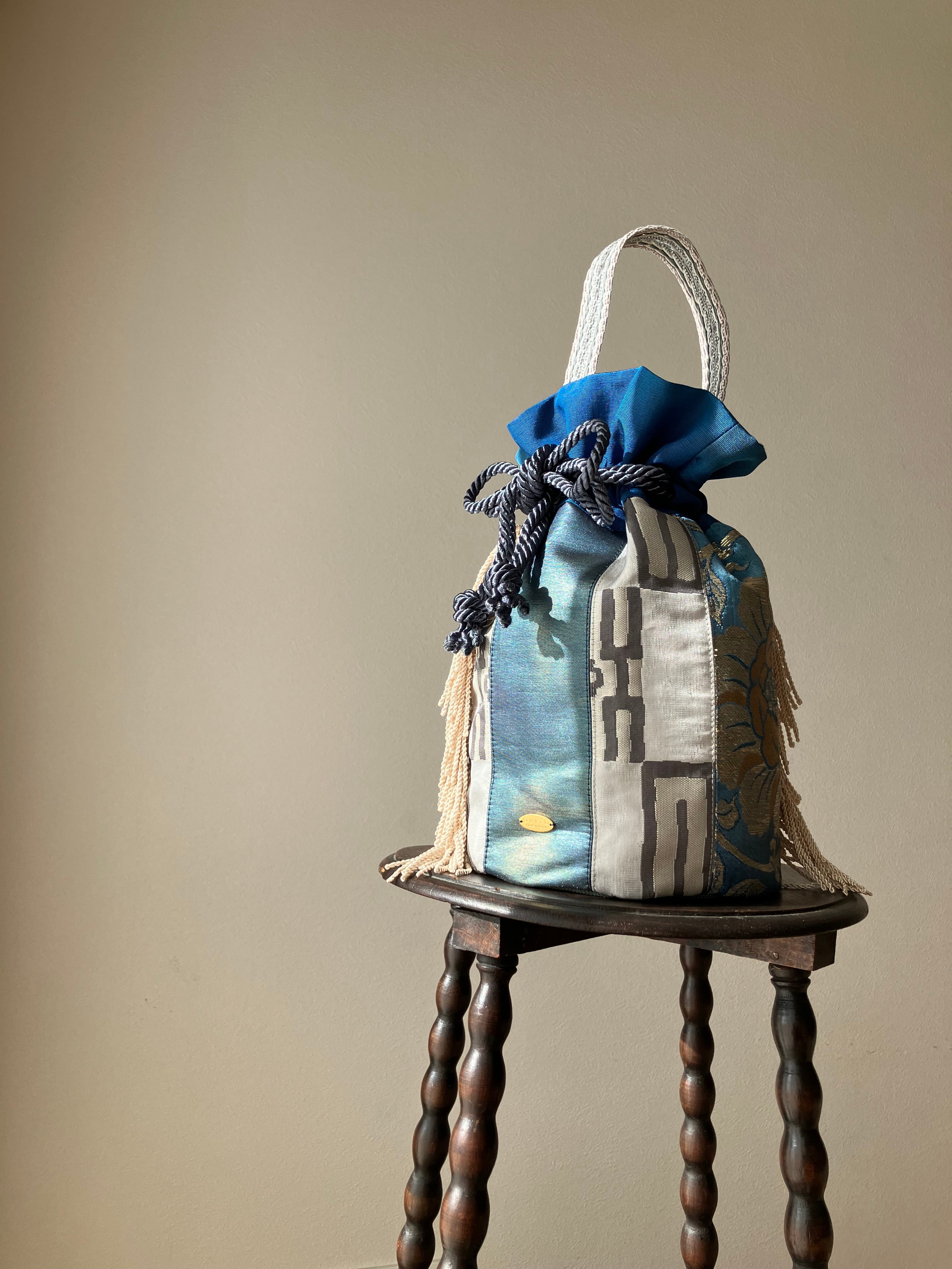 まるでパッチワークのように華やかな表情を生み出した一点物の巾着バッグです。