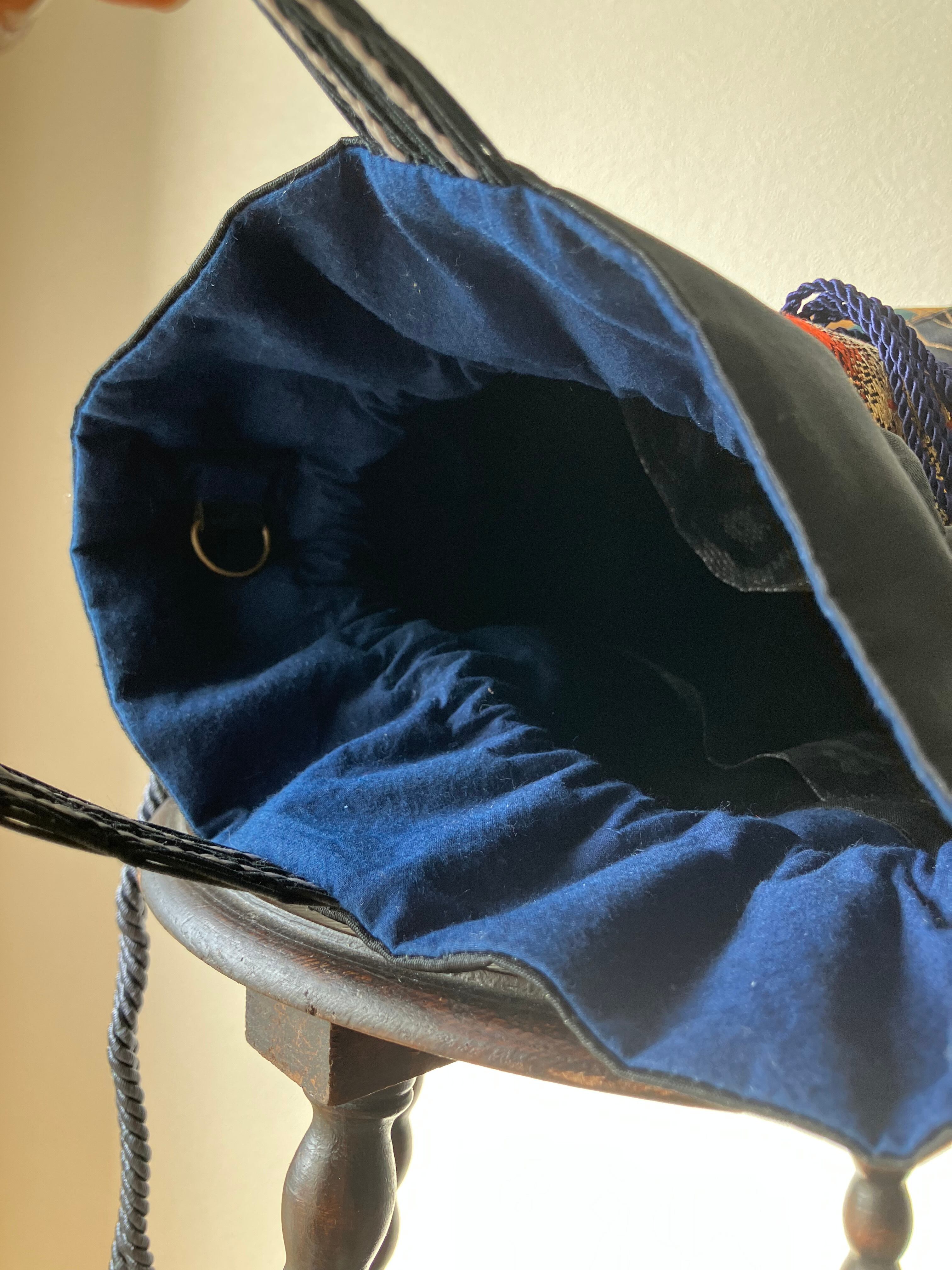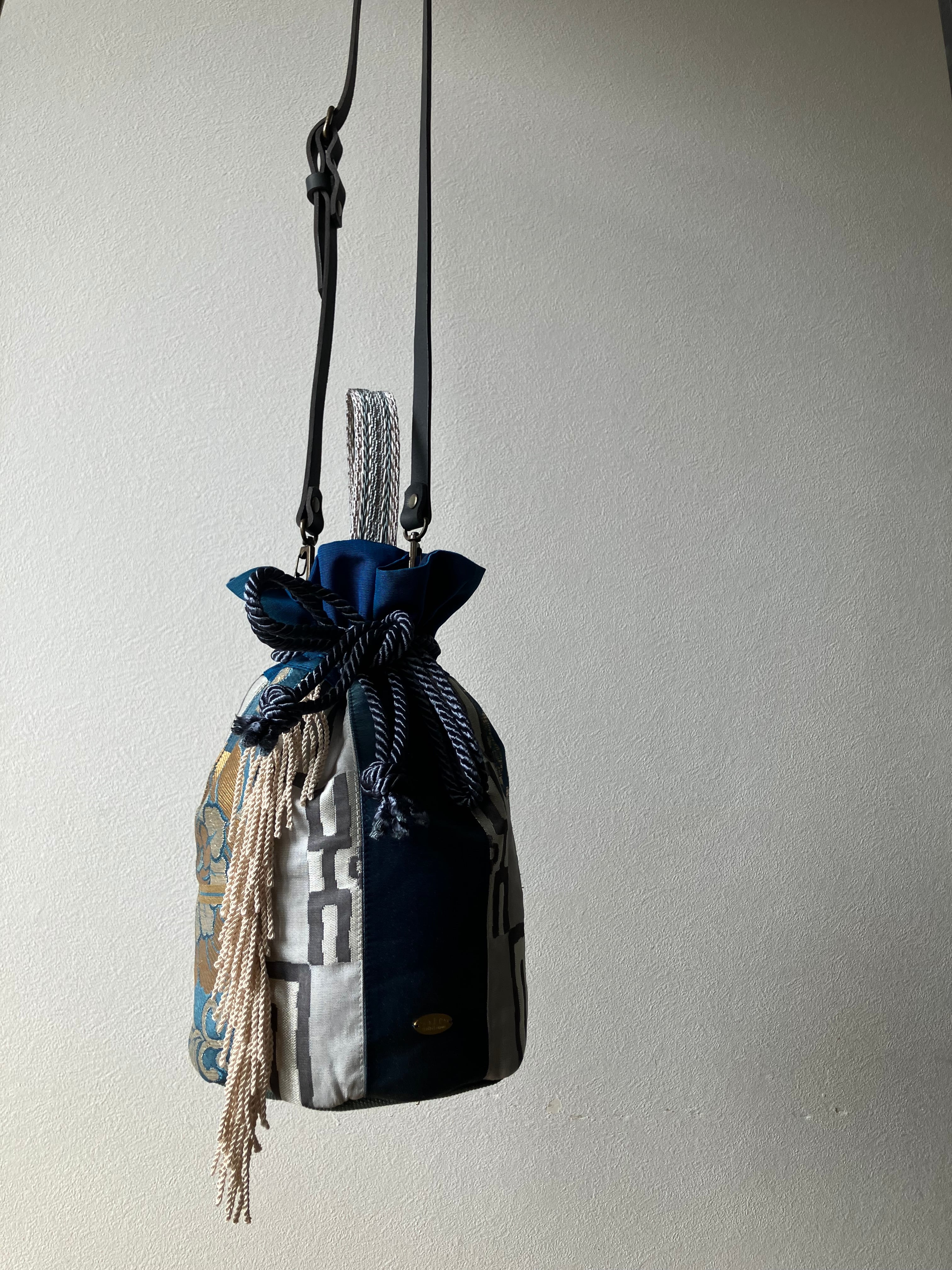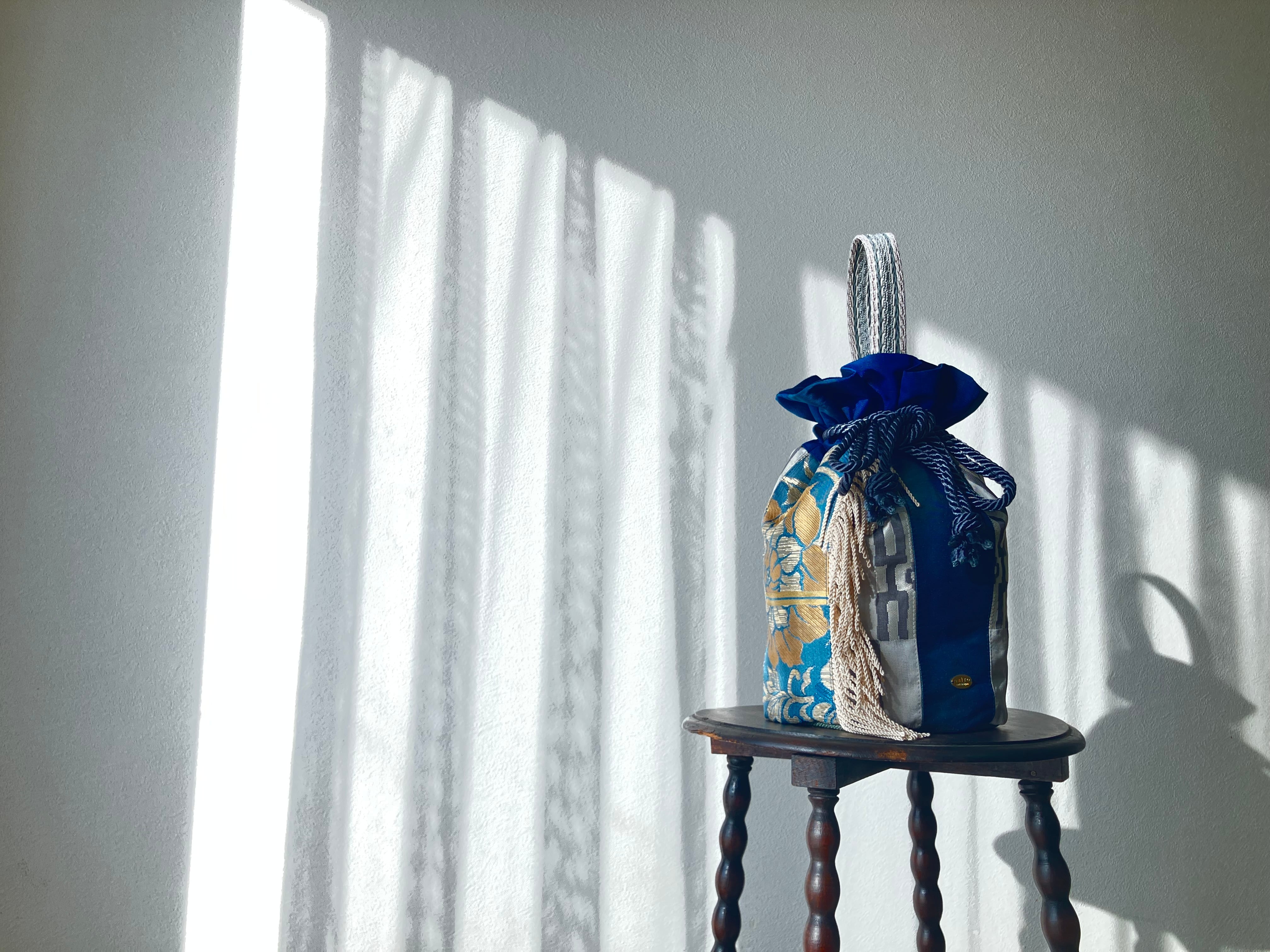 まるでパッチワークのように華やかな表情を生み出した一点物の巾着バッグです。