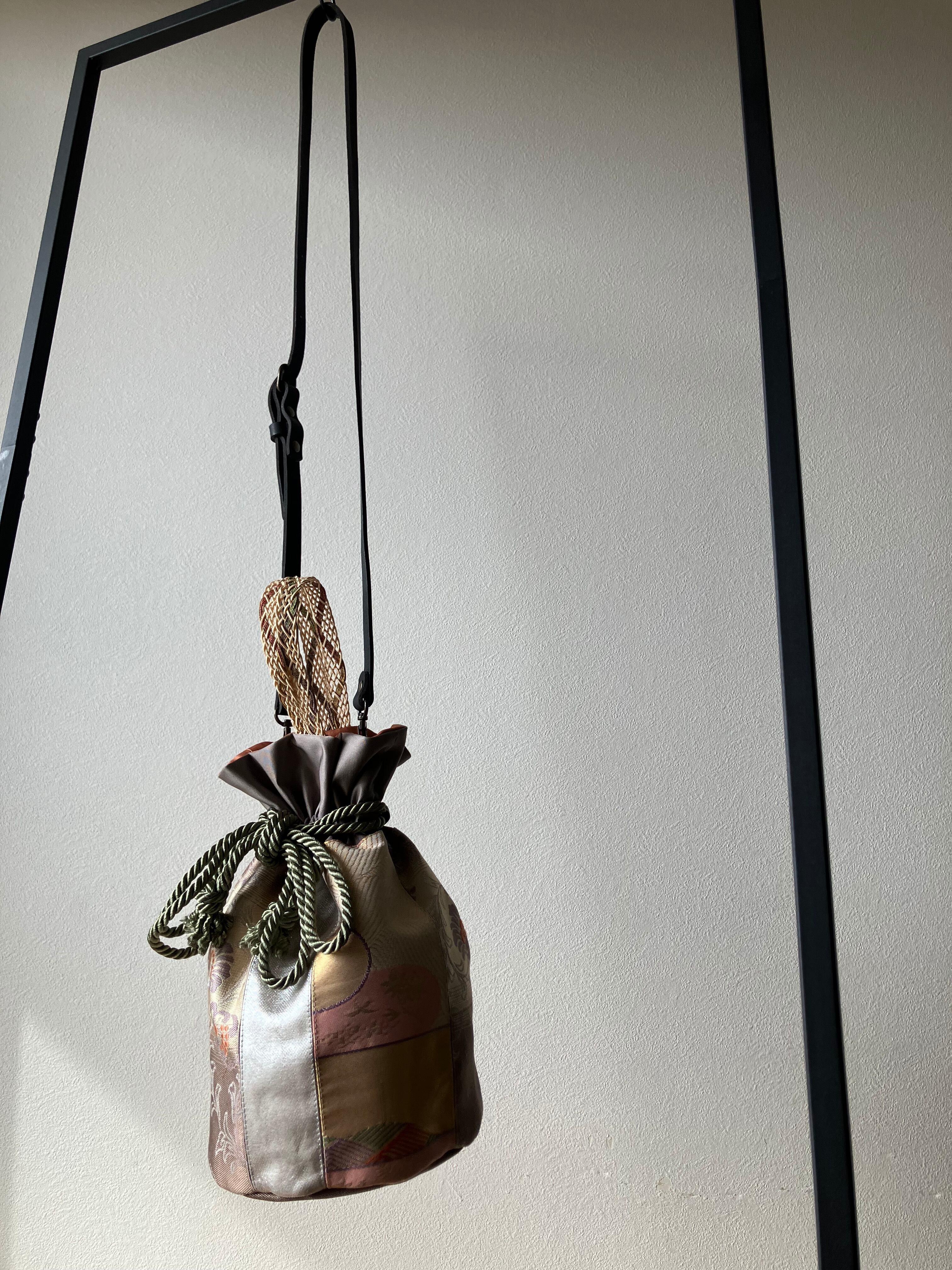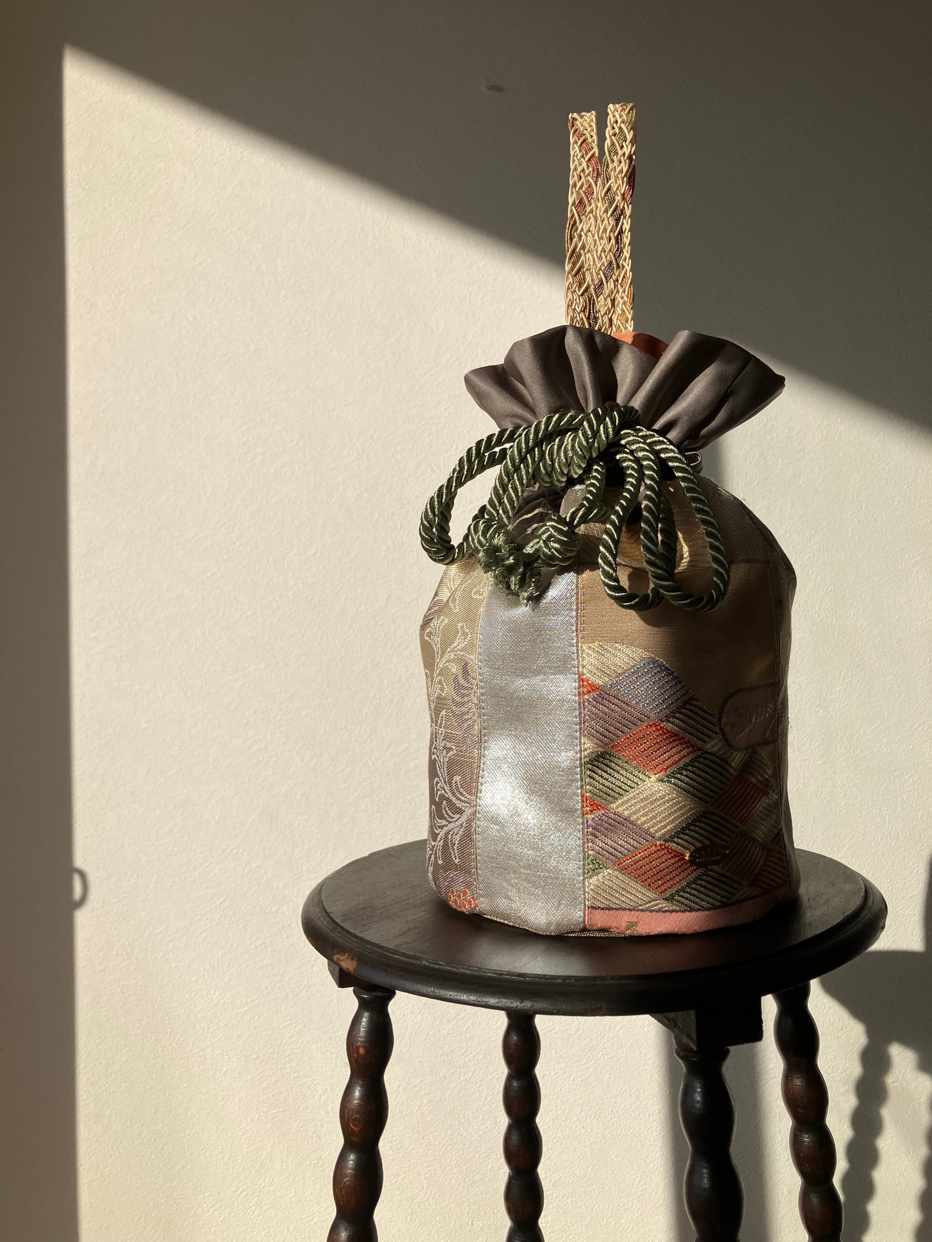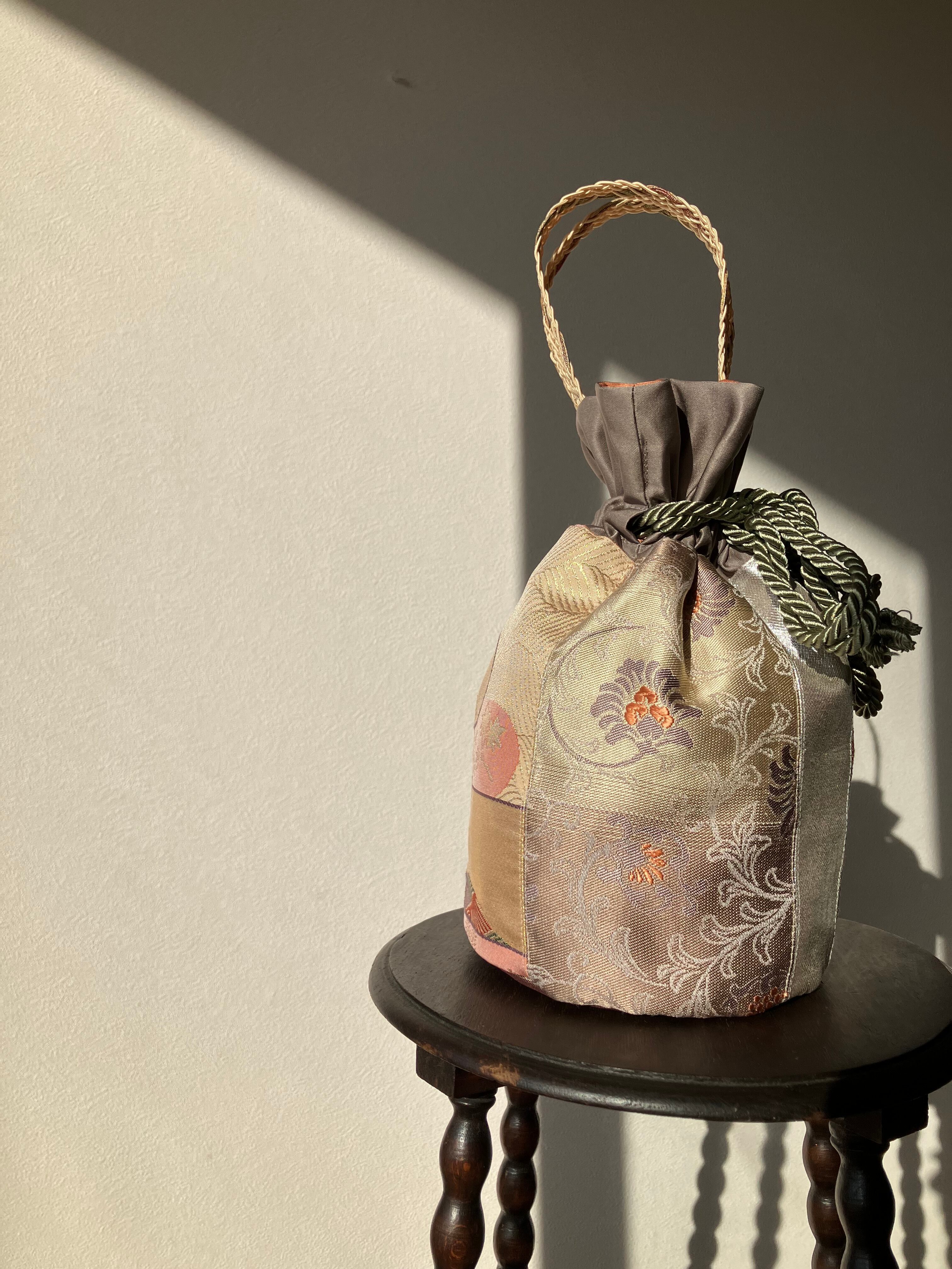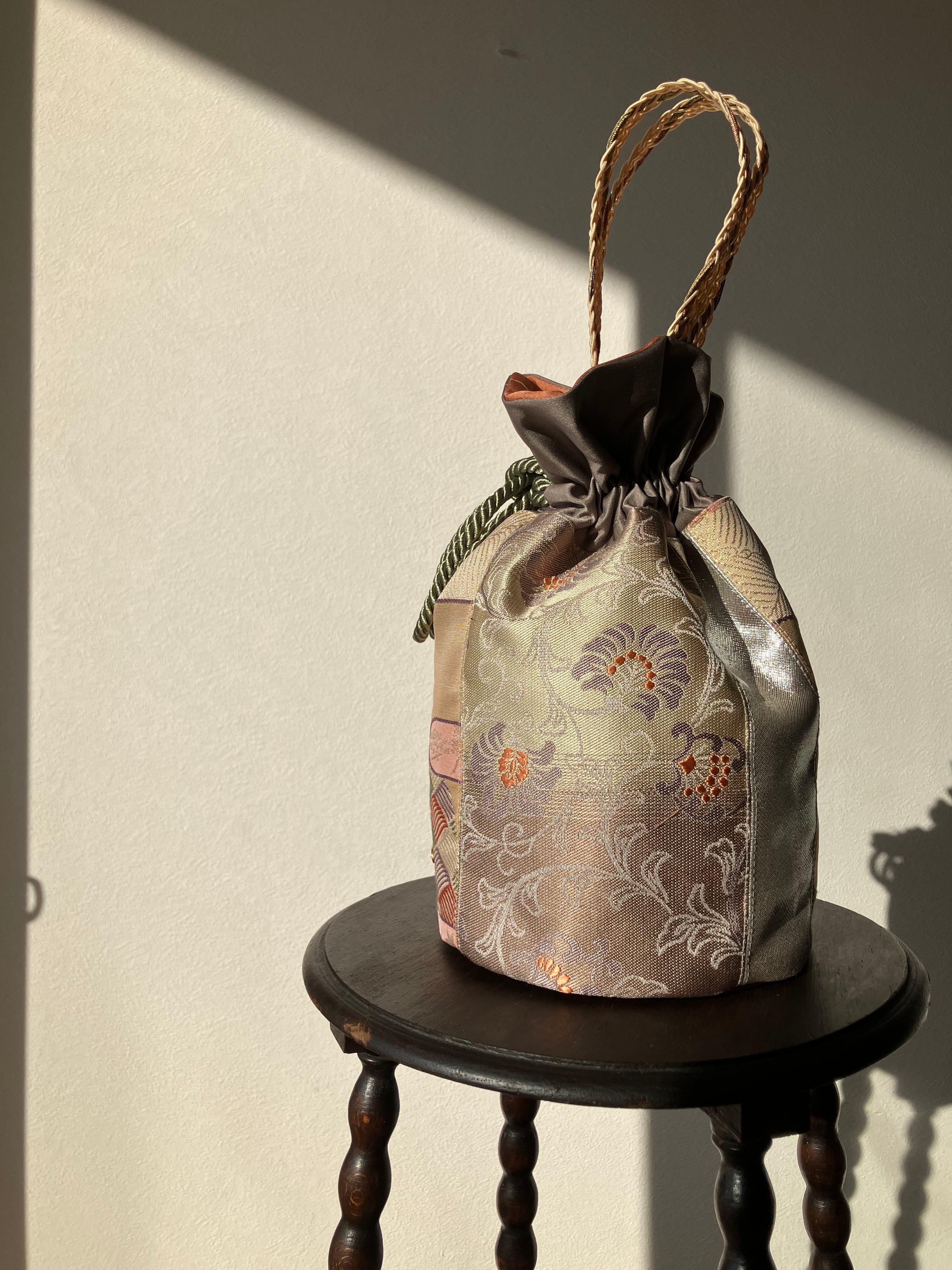 アップサイクルした帯を使用して仕立てた巾着バッグです。