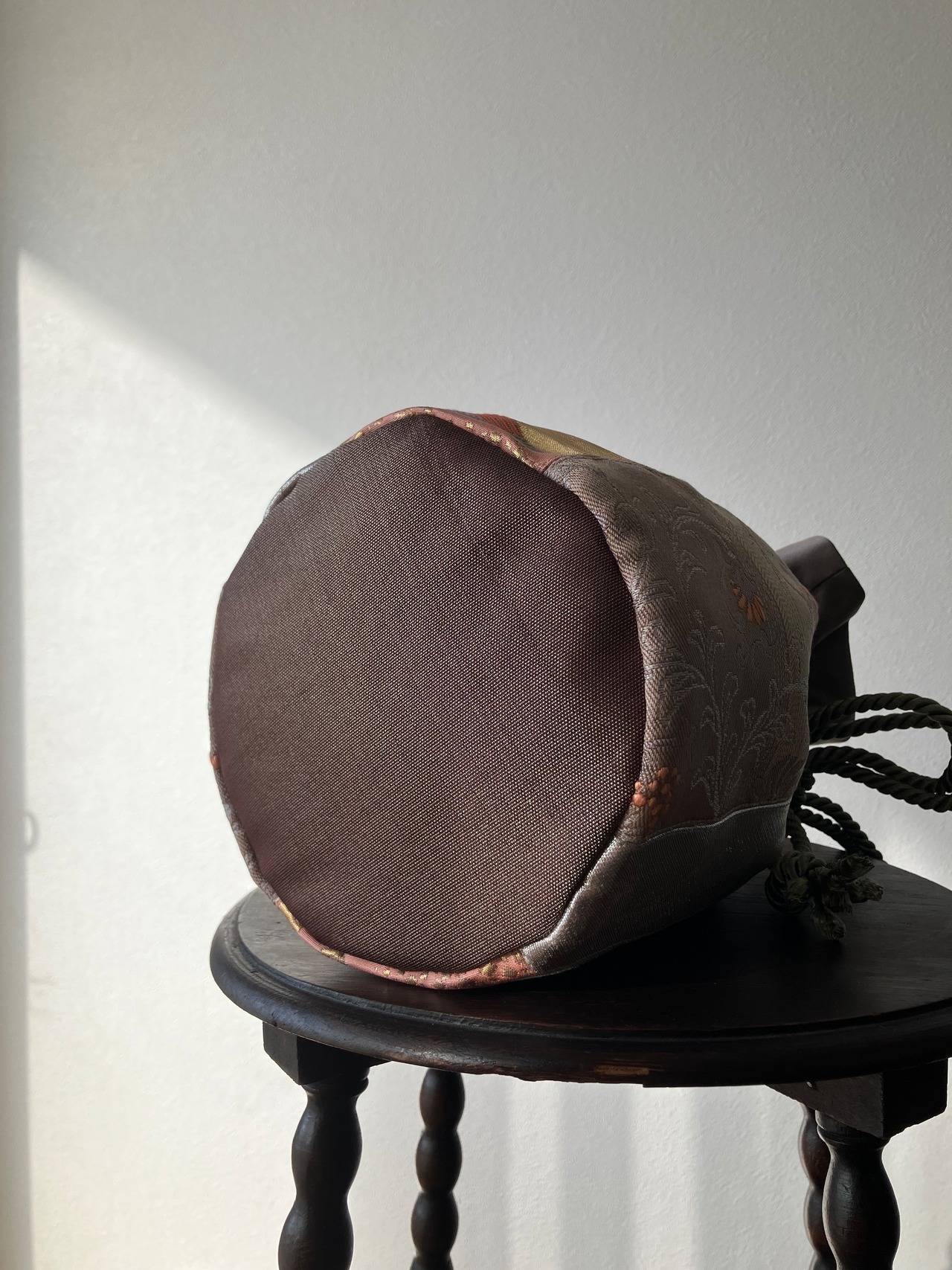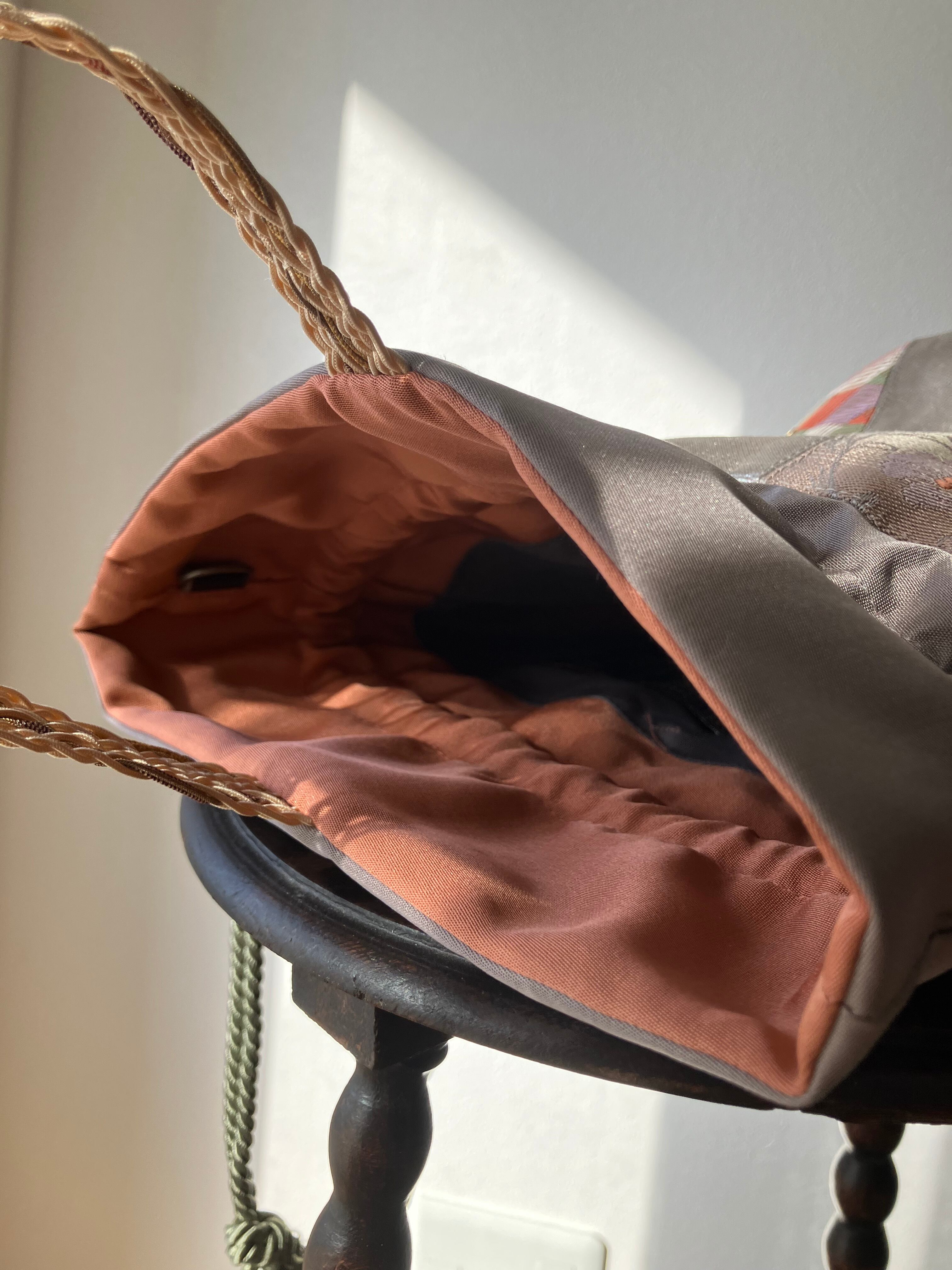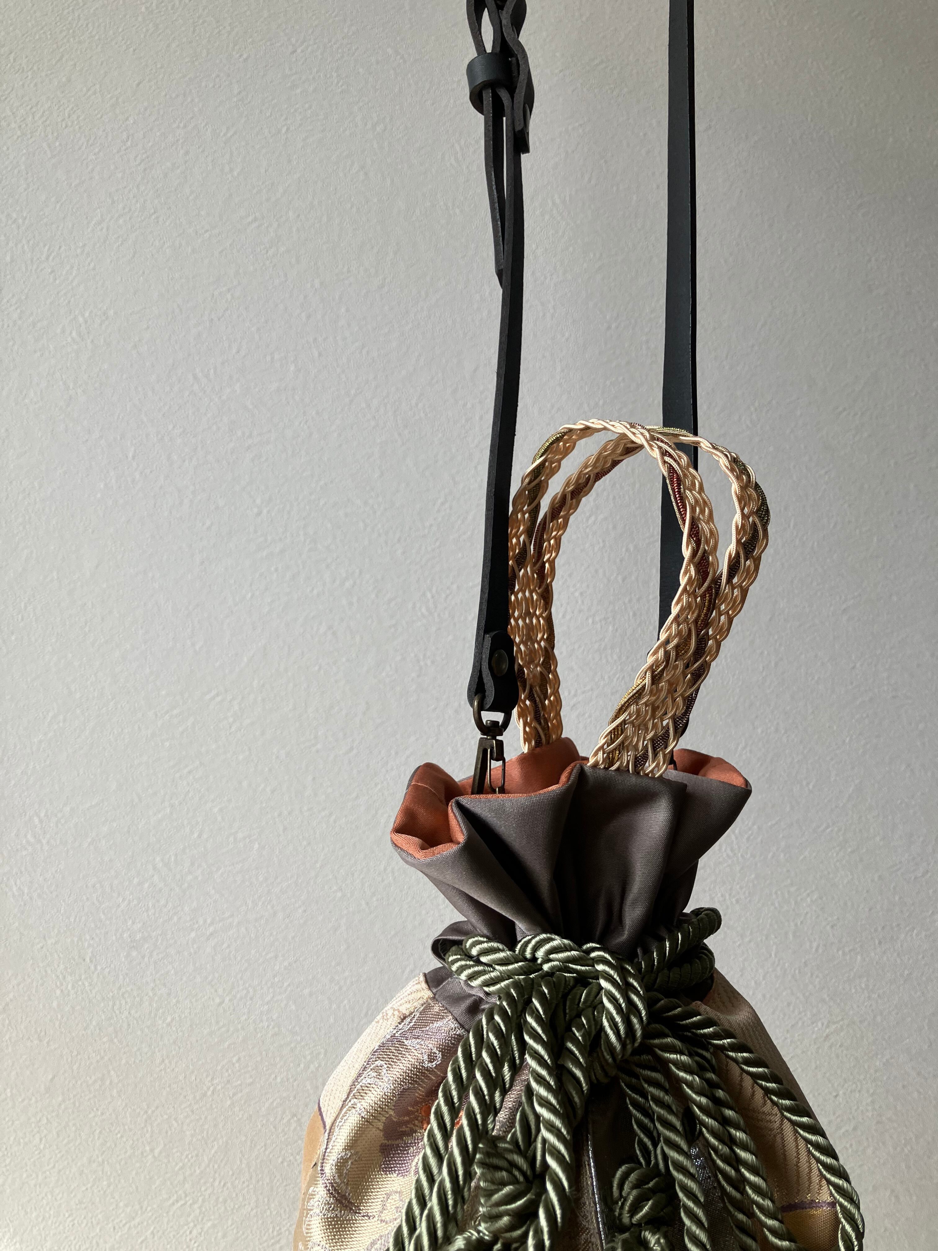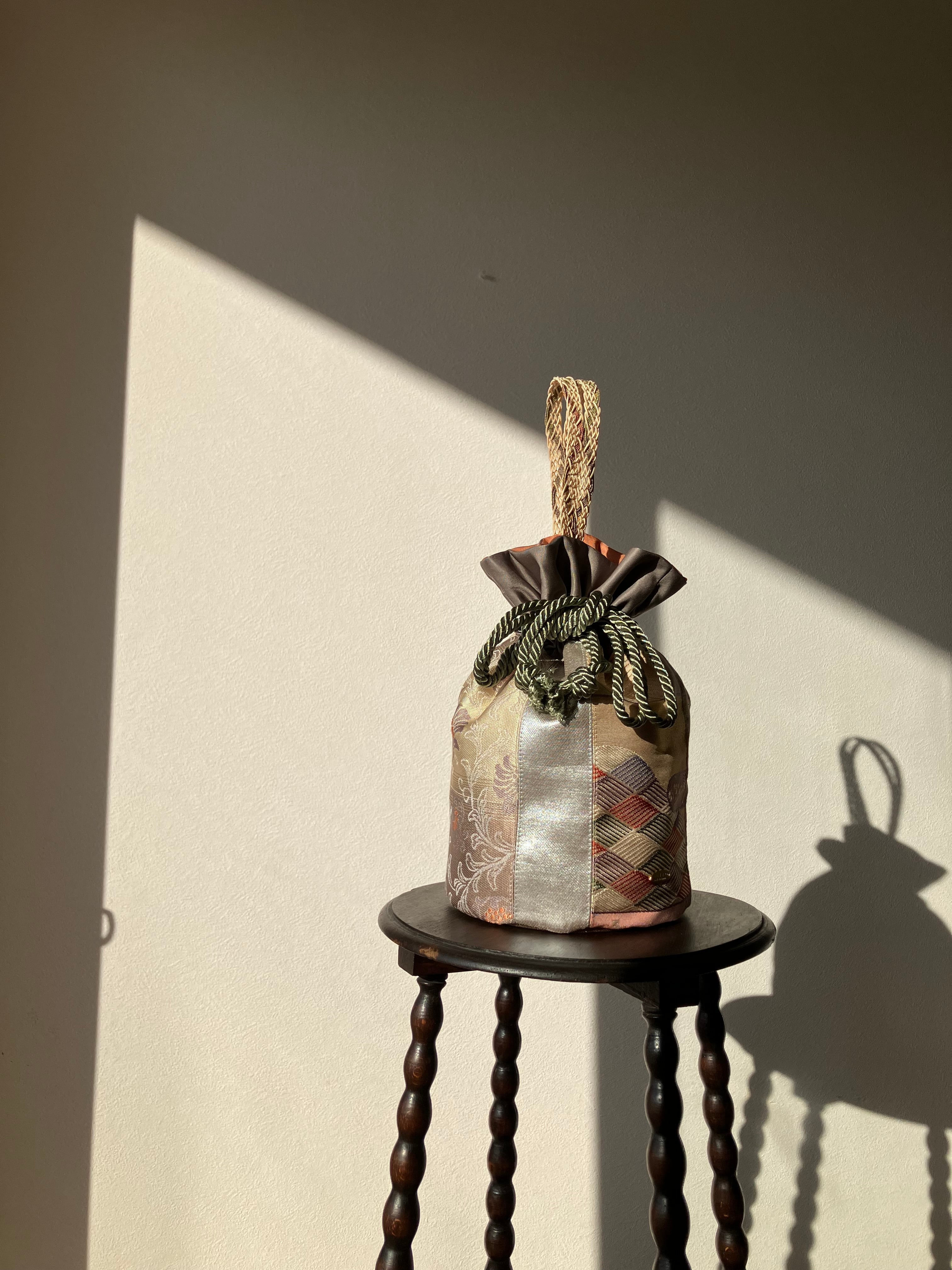 アップサイクルした帯を使用して仕立てた巾着バッグです。