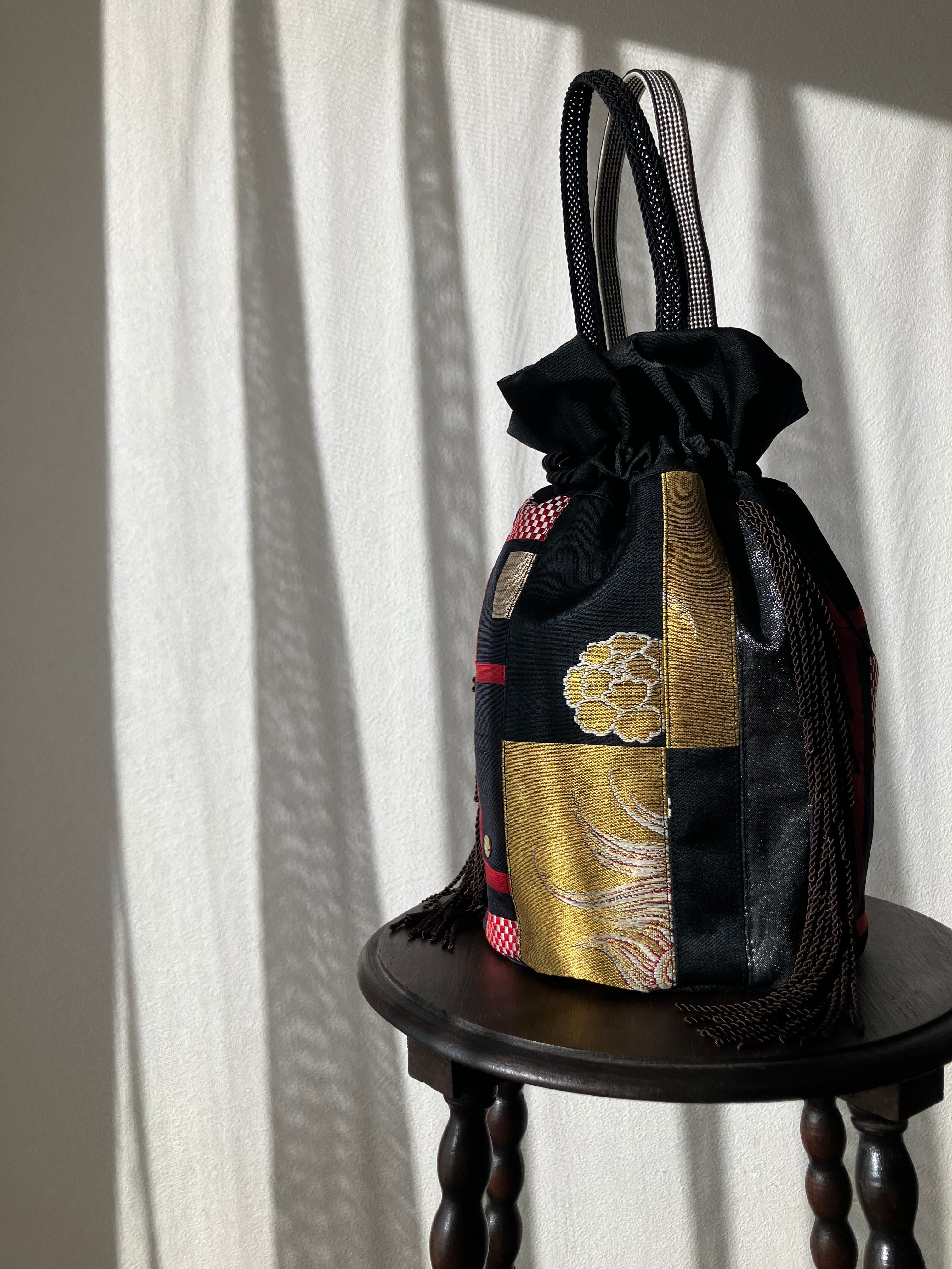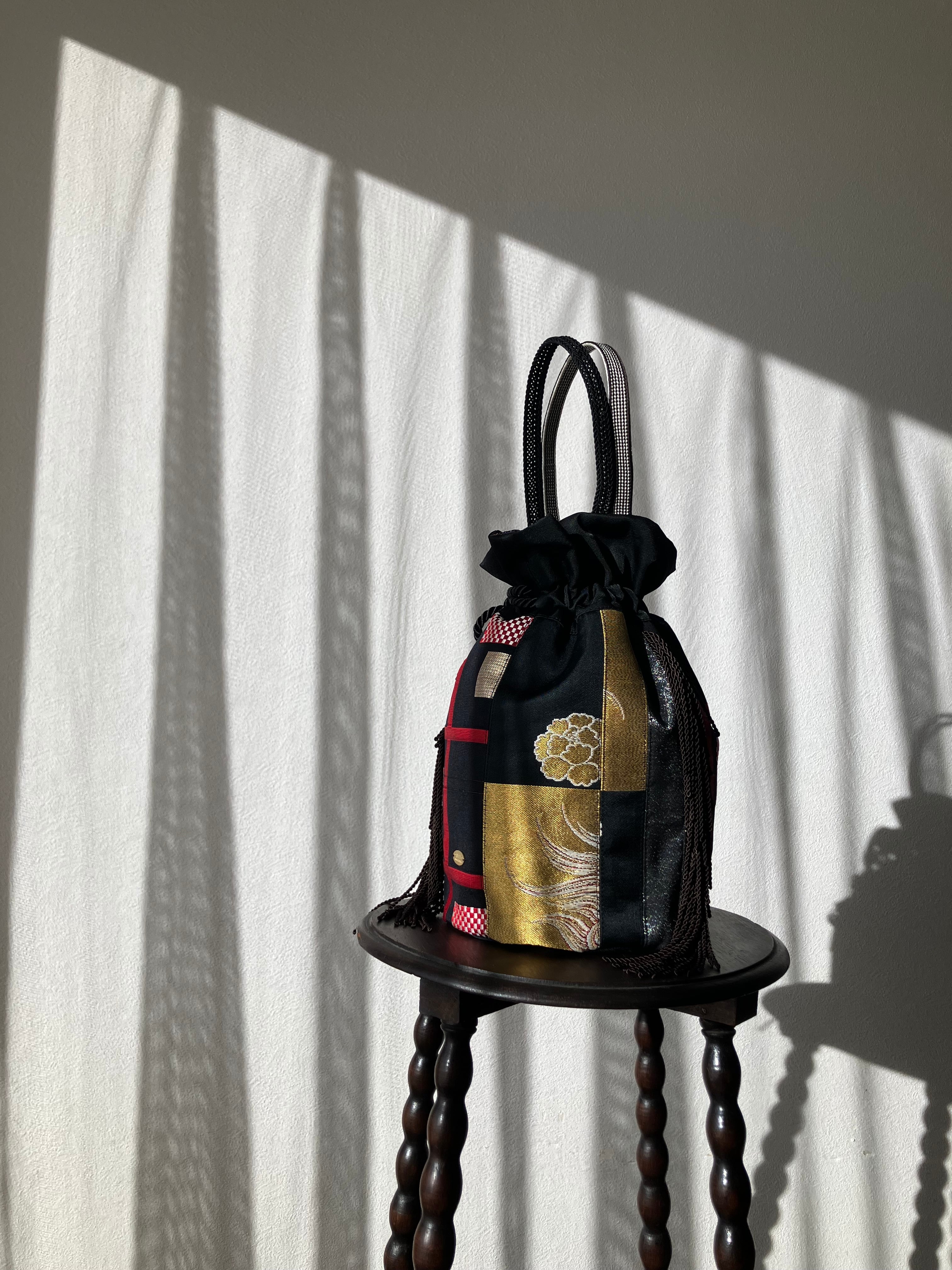 持ち手には帯締めを使用し、和の素材ならではの存在感をプラスしました。