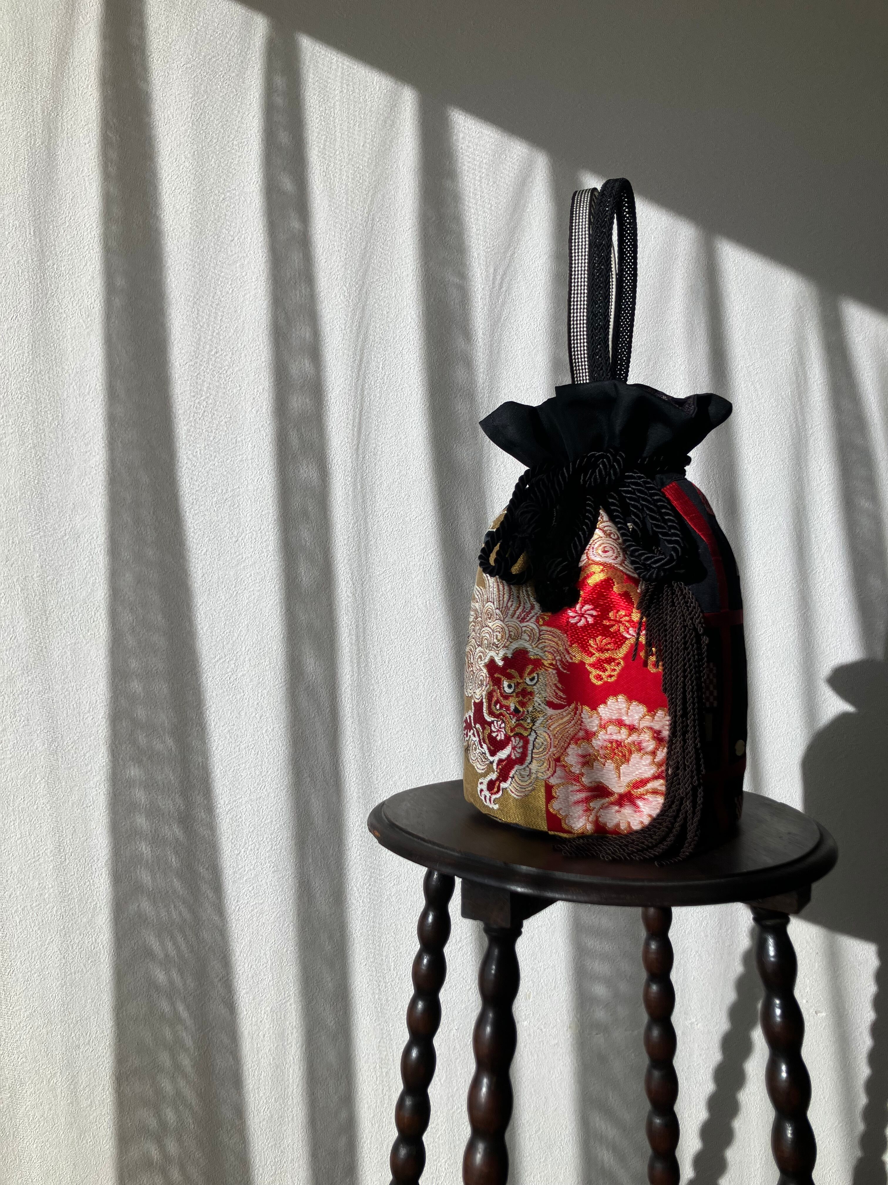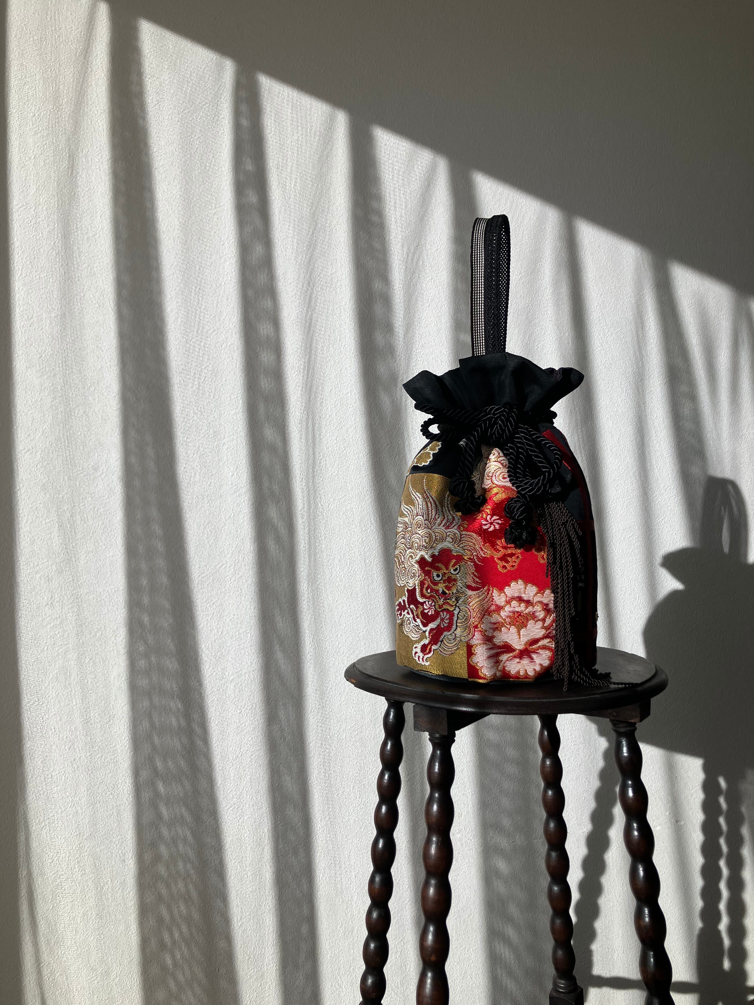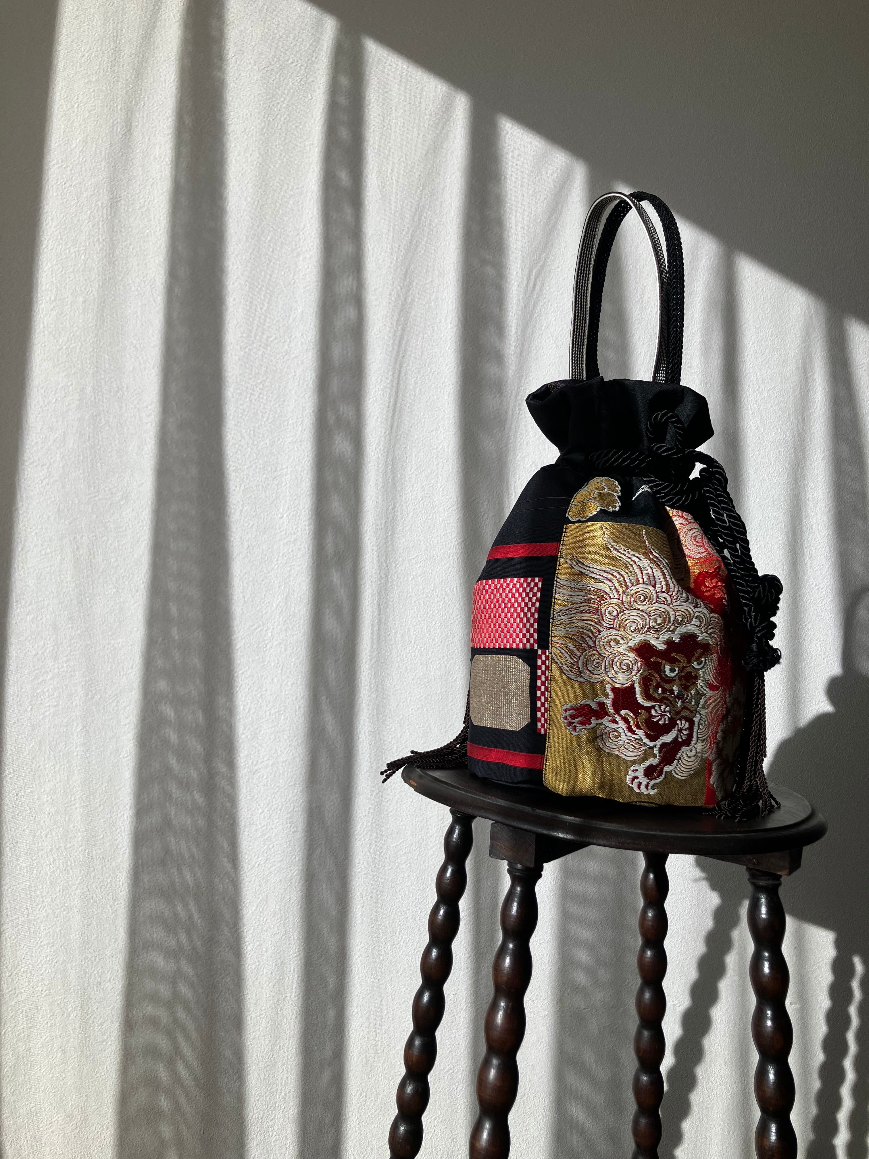 守りの象徴・獅子をまとう一点物の帯バッグ。